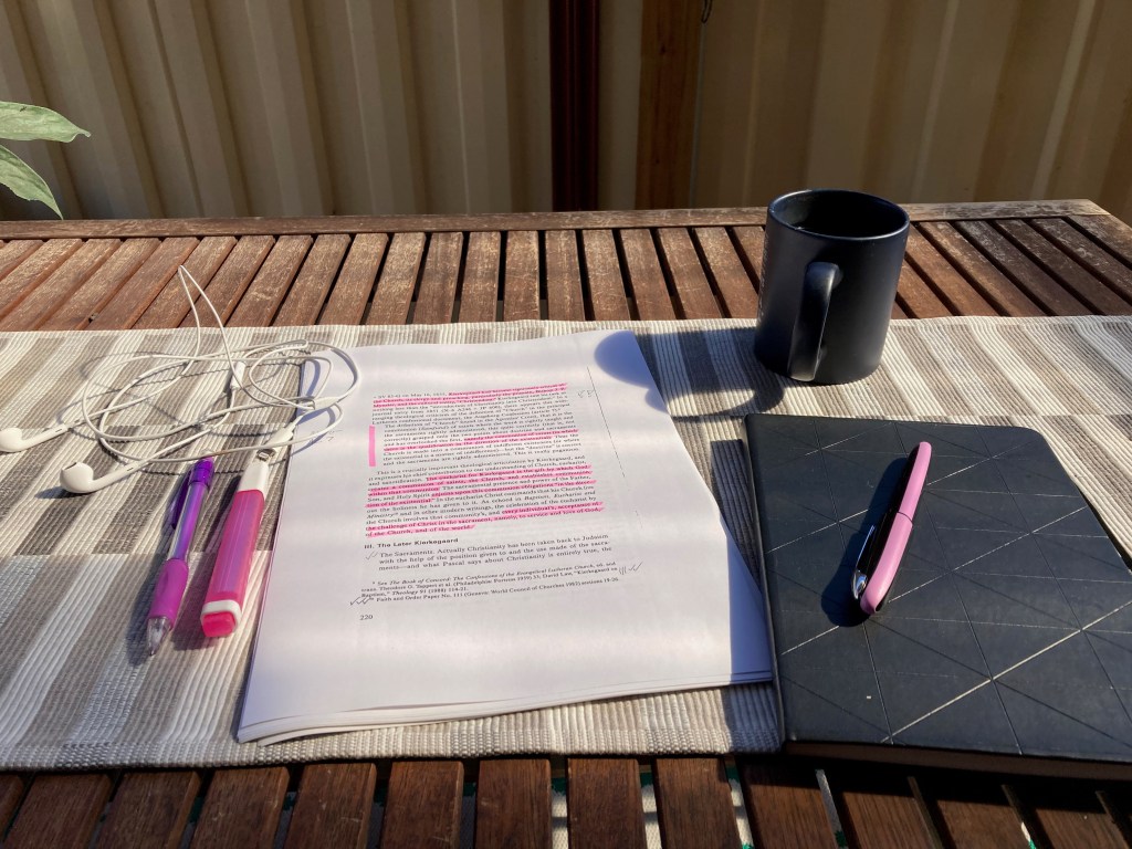 This is my happy place – sitting outside in the sun reading with a cup of tea. The notebook is my journal with my favourite pen. I listened to a meditation for calming anxiety, and read some of the article on Kierkegaard. Allowing myself to stop from the pressure I place on myself is a strange (and still somewhat awkward) feeling. Yet knowing that I can return to this place, physically and emotionally, is a really nice and calming thought.