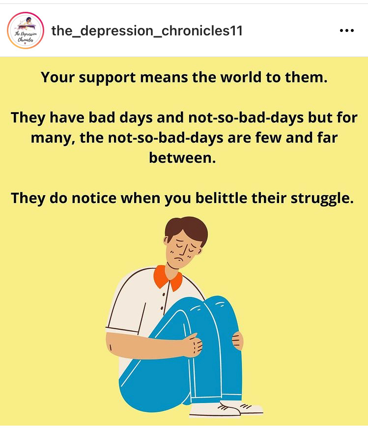 I follow The Depression Chronicles on Instagram. I often find it very helpful in expressing or putting into pictures what it feels like to live with depression. Yes, there are bad days – darkness and hurt. And there are not-so-bad days. But often these do not look much different than the bad days.