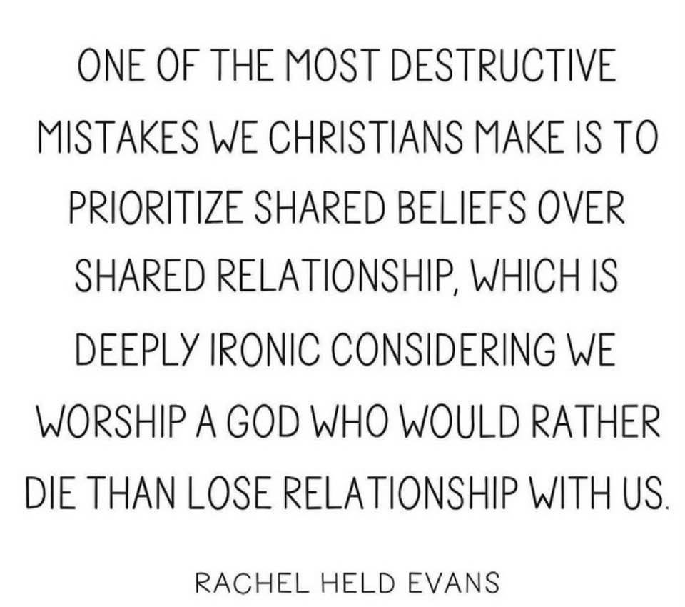 I like the phrasing, “prioritize shared beliefs over shared relationship”. Jesus first then the community. Or community in our shared relationship with Jesus. I know that I will not find another person who agrees with me in theory on Jesus because my experience of Jesus is individual and personal. And that is the mystery of the incarnation.